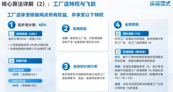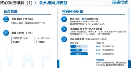 第三阶段:升级为工厂店主。投入2万元后,李姐除了零售利润,还能享受区域总销售额2%的分红。如果她培养的直推团队中有2个达到300万业绩,还能额外享受加权分红。