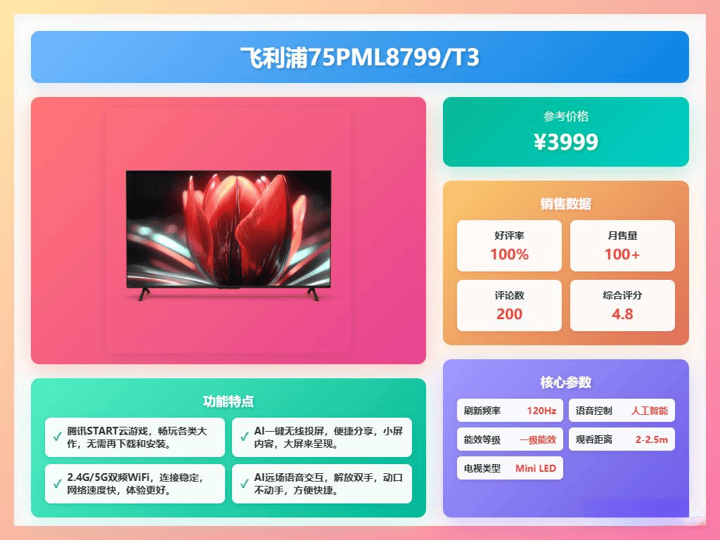 这款飞利浦75PML8799/T3采用了Mini LED背光技术,用棋盘式动态调光让画面的对比度和亮度都更丰富,色彩表现也更细腻。配合QLED纳米量子点技术,色彩变得更真实、更饱满,看电影、玩游戏都特别过瘾。120Hz的高刷新率让快速运动画面也能保持流畅,无拖影,HDR技术还能让明暗对比更自然,画面层次感十足,色彩还原非常到位,看大片像身临其境一样。