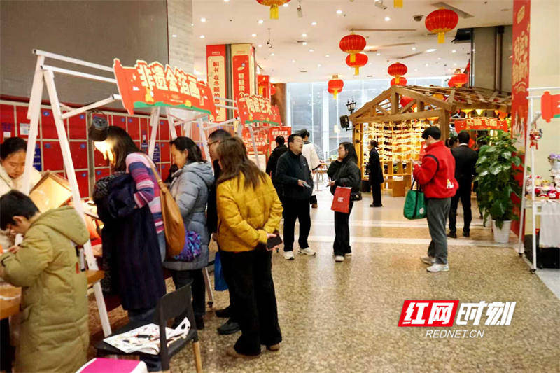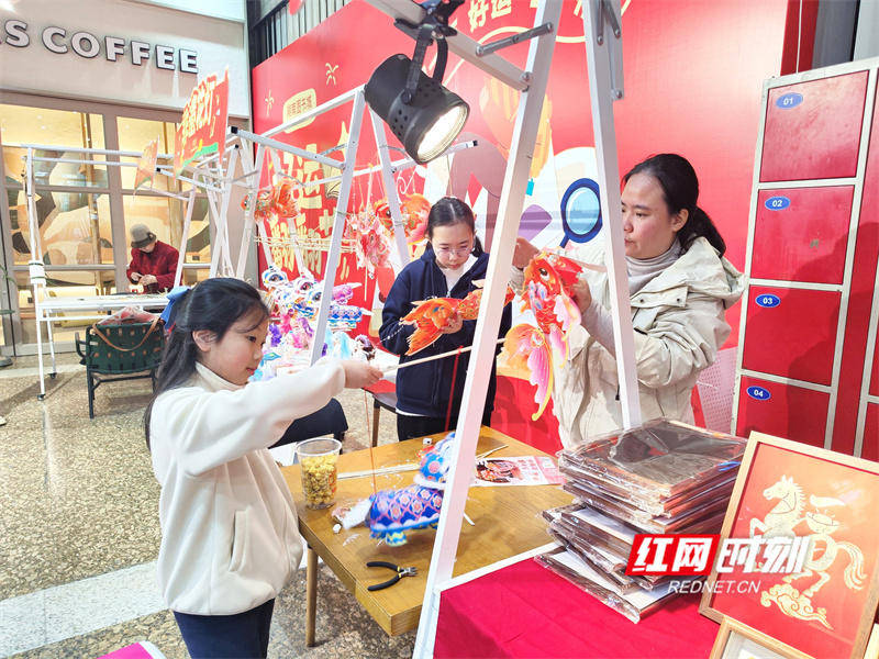 除了趣味闯关,湖南图书城一楼大厅的主题市集同样热闹非凡。棕编草编、金箔、花灯DIY、马踏飞面、陶瓷艺术、毛线钩织、糖画、吹糖人等非遗与美食摊位前,市民和读者驻足流连,在非遗传承人的指导下,动手体验花灯、金箔画等制作,挑选心仪的新年好物,品尝地道湖湘美食,在逛市集、品书香中感受浓浓的年味儿,体验集阅读、游戏、消费于一体的文化盛宴,现场欢声笑语不断。
